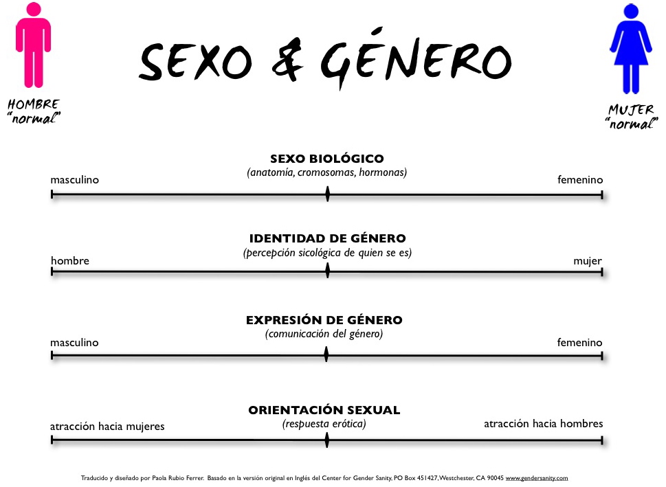 El concepto de sexo es bastante claro en el diagrama, pero el de género tiene un entretejido menos exacto, dada su referencia a la dimensión sicológica de la identidad y a la expresión del género en el diario vivir – gestos, ademanes, formas de vestir, etc. La orientación sexual es el área donde se define la atracción sexual, sea hacia un sexo u otro, o hacia ambos sexos (bisexual) o ninguno (asexual). De acuerdo a mi sexo soy mujer, pero en mi identidad de género (es decir, mi manera de sentirme y de pensarme a mí misma) me identifico más en el medio, algo así como un tercer género que abarca ambas nociones. Quizás sea ese también el caso de mi expresión de género, donde aunque tiendo hacia una leve ambivalencia, tengo una marcada inclinación hacia el lado femenino. Mi orientación sexual se precisa al extremo derecho como heterosexual.