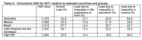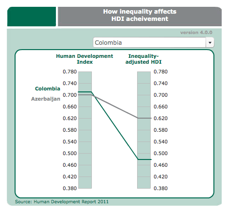 Pero si Colombia registra un puntaje regular en el HDI, el índice se hace aún menor cuando se mide en términos de inequidad. En condiciones de perfecta igualdad social, el I-HDI y el HDI equivaldrían a la misma cifra, pero el análisis del I-HDI hace un ajuste a la capacidad que cada país tiene para el desarrollo (HDI), al computarla con el índice que describe la realidad de la desigualdad social específica dentro de ese territorio. Para hacerlo más claro, el I-HDI es el verdadero índice de desarrollo humano, mientras que el HDI es la medida del potencial hacia ese desarrollo. A mayor desigualdad, mayor diferencia entre ambas cifras.