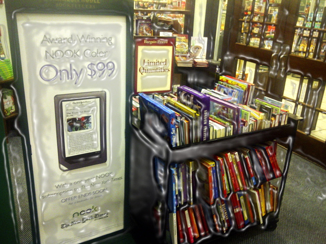 Crucé el portón de la entrada y, como a quien lo ataca una corazonada, entendí el efecto contundente de los nuevos medios digitales sobre un negocio como éste, entendí el fatalismo de los detractores de lo digital/ fanáticos de lo análogo. Era obvio, tan obvio como ese mostrador que daba la bienvenida al lugar, obstaculizando el corredor principal, dando gritos para no ser ignorado. El aparatoso estandarte promocionaba el Nook, lector digital producido por esta librería, cuya popularidad no ha logrado competir con el nivel de ventas del Kindle de Amazon, ni con el iPad de Apple.