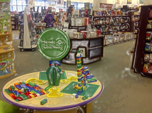 Seguí caminando, como quien reconoce los rincones de la casa de infancia después de veinte años, y los habituales mostradores de libros estaban ahora ocupados por juguetes para el aprendizaje, catalogados por edades, marcas y objetivos. Un hombrecillo Lego, leyendo un libro titulado “Barnes & Noble” (en medio de tres monstruosos mostradores de la misma marca de bloques coloridos), se erigía como el monumento al esfuerzo de quienes se unen para dar la batalla de supervivencia, una asociación entre dos de las industrias que se han visto profundamente afectadas en su volumen de ventas, a raíz de la generación de nuevas maneras de leer, escribir,  jugar y aprender. Sí, no olvidemos que las nuevas tecnologías no son sólo artefactos electrónicos; son los medios que han generado nuevas prácticas y lógicas para operar en la vida cotidiana.