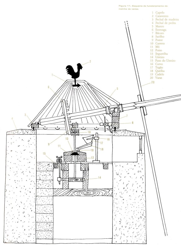 Después, de acuerdo a como estaba y de donde venía el viento, la capota del molino rodaba. En aquellas partes que se ven allí, todo a la mano, entraban una varas de eucalipto que eran afiladas en cuadrado en la punta más gruesa y cortadas a la misma medida. Para hacer rodar esta rueda, que es un tipo de una rueda dentada -pero hecha a mano-, a través del carreto se hacía mover toda la fuerza de las mós, hacía rodar las mós (ver glosario en la foto inferior).